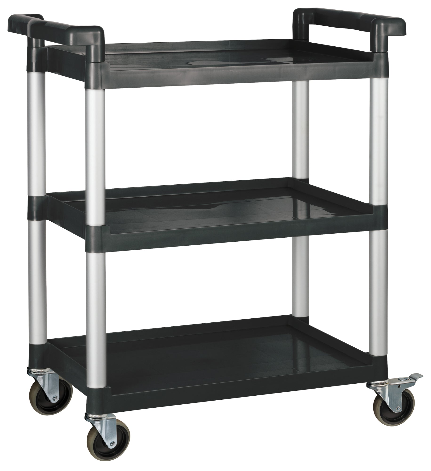 • The Winco heavy-duty utility cart has a 330 pound weight capacity and was designed for commercial use in restaurants, offices, warehouses and more. This utility cart features 3 shelves and has overall dimensions of 32” x 16.125” x 36.75” (L x W x H). The 4 swivel casters allow for easy maneuverability even when transporting heavy loads. Two brakes secure the cart when stationary. The polypropylene shelves are easy to clean making this an ideal bussing cart.