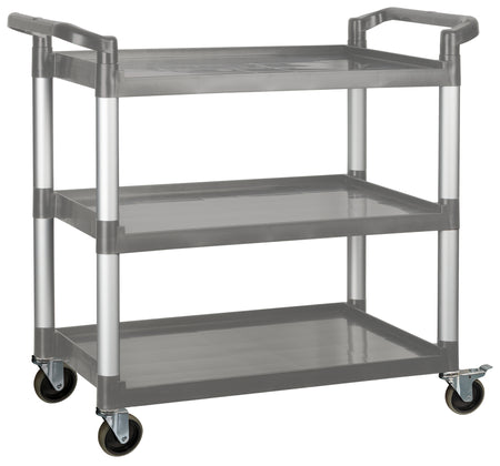 The Winco heavy-duty utility cart has a 400 pound weight capacity and was designed for commercial use in restaurants, offices, warehouses and more. This utility cart features 3 shelves and has overall dimensions of 40.75” x 19.5” x 37.375” (L x W x H). The 4 swivel casters allow for easy maneuverability even when transporting heavy loads. Two brakes secure the cart when stationary. The polypropylene shelves are easy to clean making this an ideal bussing cart.