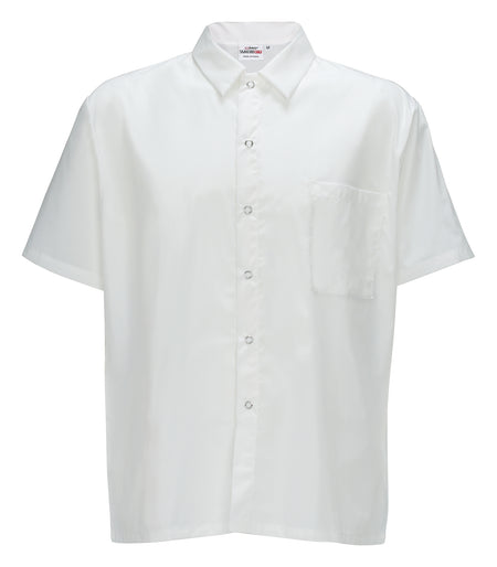 • Breathable – Lightweight poly-cotton blend ensures breathability in hot kitchens • Classic Styling – Clean lines create a timeless silhouette ideal for hotels, restaurants and other upscale venues • Chest Pocket – Easily store thermometers, pens and more • Snap Buttons – Features 6 snap closures to securely fasten the shirt creating a formal uniformed appearance • Machine Washable