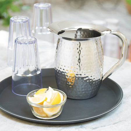 The Winco WPB-2CH offers professional-grade construction and thoughtful features to elevate beverage service. Its heavy-duty stainless steel body and hammered finish resist visible wear, while the integrated ice catcher prevents splashback and keeps drinks crisp. Whether you're managing a crowded service station or catering a formal event, this 2-quart pitcher ensures clean, efficient, and attractive beverage delivery. It provides an upgraded experience over plastic or low-grade alternatives, with lasting durability and superior handling performance.