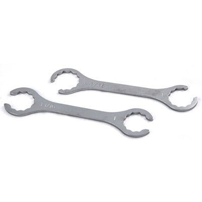 Wrench set for draft towers, stainless steel, one wrench with side access, and one with center access. Both wrenches have 1-1/16" and 1" openings.